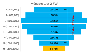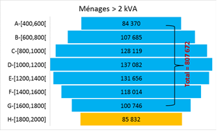 Parmi cette catégorie de ménages, plus d’un million à la tranche tarifaire économique 1 & 2 kiloVolt-Ampère (kVA) par l’état,alors que plus de 800 000 ménages appartiennent à la tranche normale (>2 kVA).Ces consommateurs sont en majorité les plus subventionnés sur les tarifs de l’électricité et font partie d’une couche Economique à faibles et moyens revenus. Par conséquent, il demeure primordial de les cibler afin de réduire leur vulnérabilité énergétique d’une part et de diminuer les subventions accordées par l’Etat au secteur électrique d’autre part.